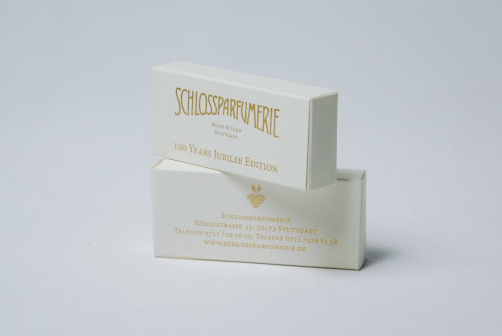 Die Wahl von cremefarbenem Karton unterstreicht die Qualität und Reinheit der Produkte der Schlossparfumerie. Diese Kombination lebt von der Spannung zwischen pompösen Gold und schlichtem Weiß.