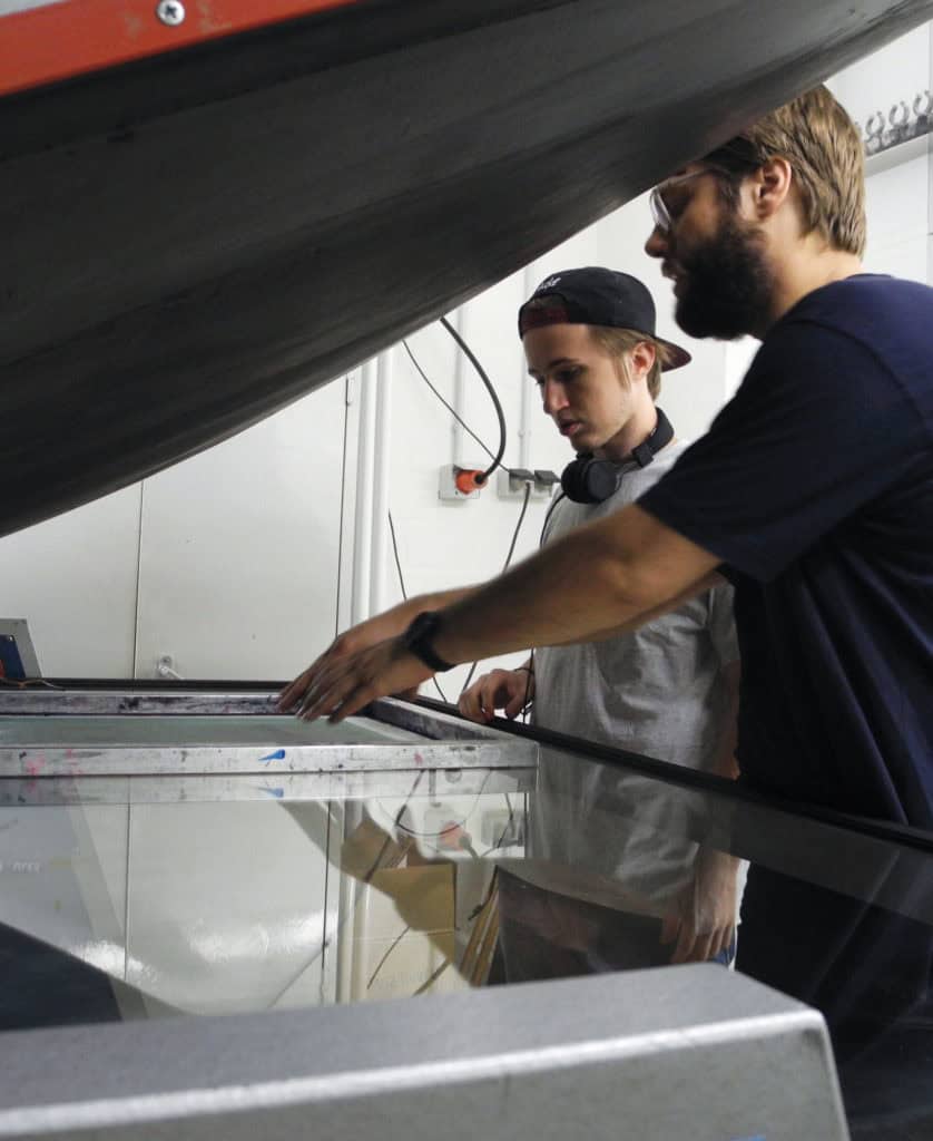 Dort kam ich während des ersten Trimesters in einem Abendkurs in Berührung mit dem Siebdruck und war sofort fasziniert von den Möglichkeiten.